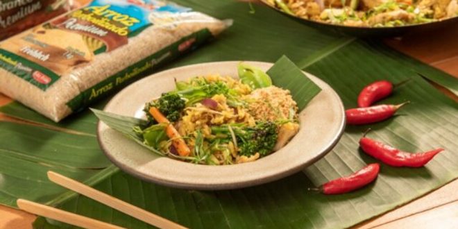 Retorne com as iscas de frango e os legumes para a wok e misture bem. Corrija o sal. Finalize o Arroz Oriental com o amendoim e cebolinha verde picada.