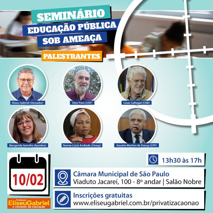 Para refletir sobre o assunto e construir propostas concretas para combater esse absurdo, realizo nesta segunda-feira, 10 de fevereiro, das 13h30 às 17h, o Seminário “Educação Pública Sob Ameaça”.