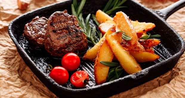 Deixe cozinhar em fogo baixo por aproximadamente 30 minutos. Faça cortes nas batatas e acrescente os ramos de alecrim entre os cortes. Coloque as batatas junto com a carne, regue com azeite e deixe cozinhando por mais 10 minuto. Sirva a carne com as batatas.