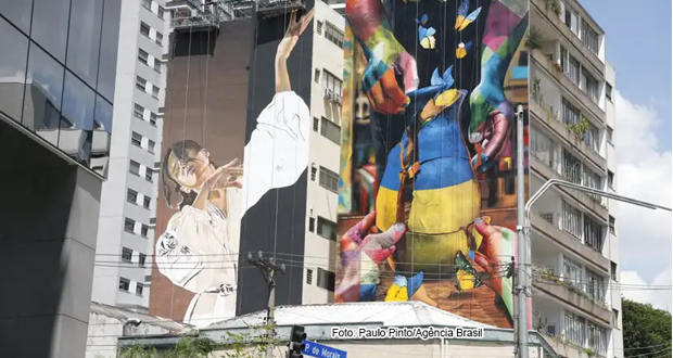 A parceria é inédita e teve o apoio do Instituto Ucraniano. Intitulada de “The Exchange” (o intercâmbio), a obra foi inaugurada nesta terça-feira, 5 de março, em um prédio de 9 andares que fica na esquina da Rua Pedroso de Moraes com Rua Pinheiros.