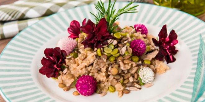 Coloque o vinho e mexa bem, até que evapore. Vá acrescentando o caldo de legumes, mexendo sempre, até que o arroz esteja pronto. Reserve. Sirva o arroz com grãos de lentilha, sementes, alecrim e flores comestíveis.