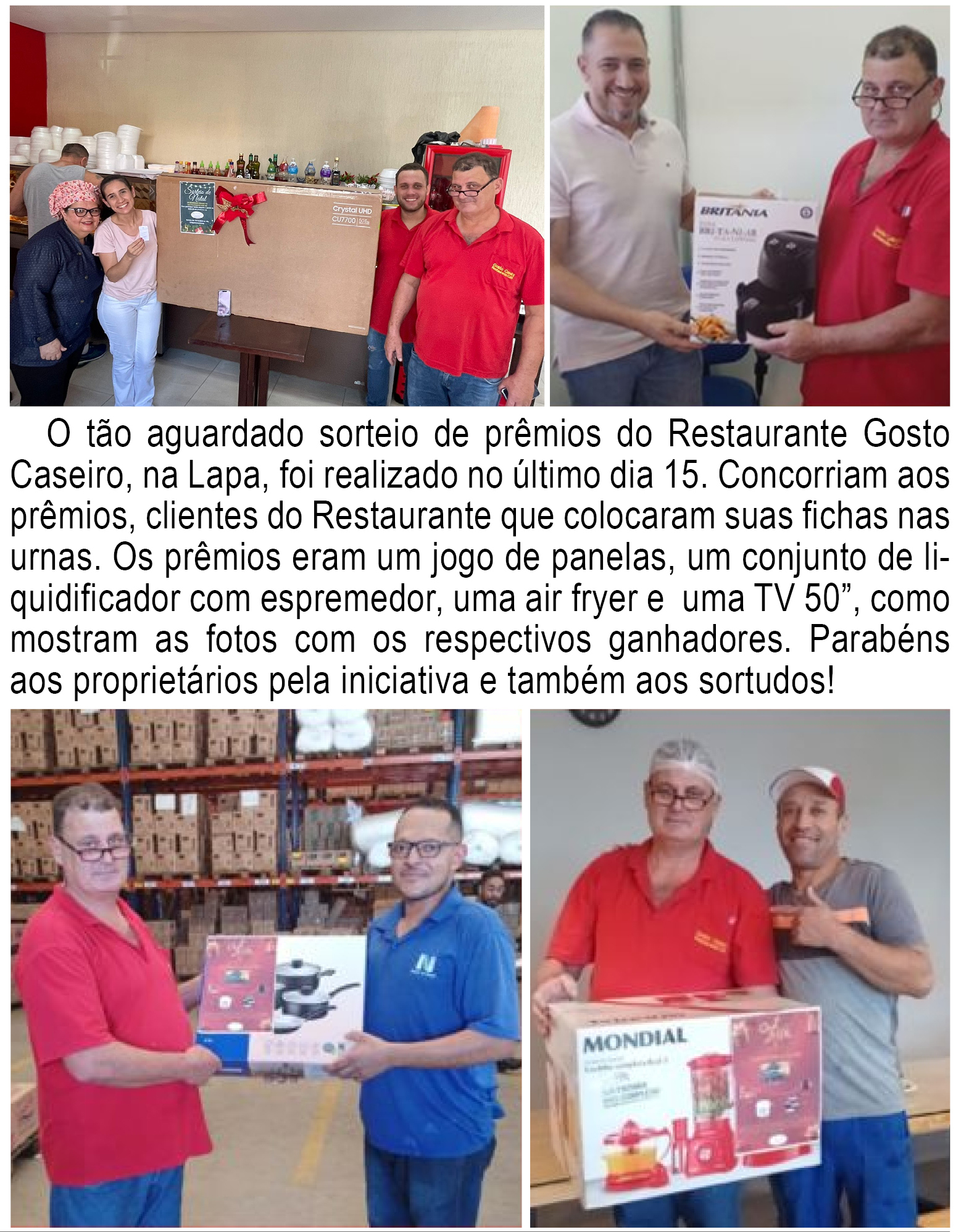 Sorteio de prêmios do Restaurante Gosto Caseiro, na Lapa Vip 423 Acessos Redes Sociais Facebook LinkedIn
