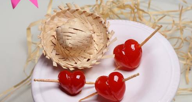 Modo de preparo dos Tomatinhos: Separe os tomatinhos em pares, mesmo tamanho e formato, pois são necessários 2 frutos para fazer um coração. Corte-os na diagonal, deixando a extremidade mais arredondada para a parte superior do coração.Inicie o corte, aproximadamente, no segundo terço do tomatinho e finalize na ponta oposta. Retire as sementes e descarte-as juntamente com as partes menores. Junte os pares, formando o coração com auxílio do palito) e reserve-os sob gelo.